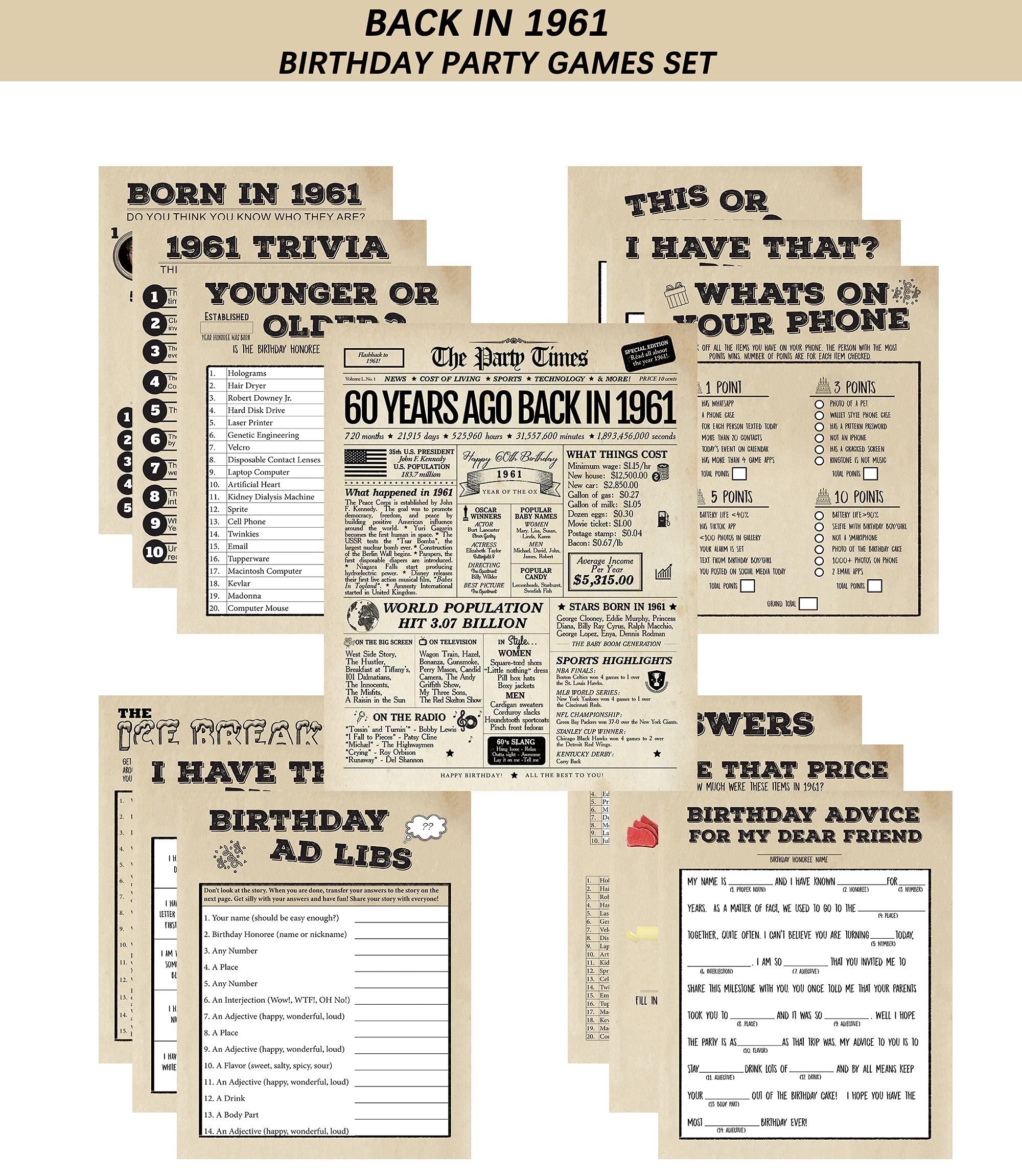 Amazon Com 60th Birthday Decorations For Women Or Men Back In 1961 Printable Party Games Set Classy Vintage Table Decor Birthday Card Poster Party For Him Or Her Turning 60 Years Old Gifts